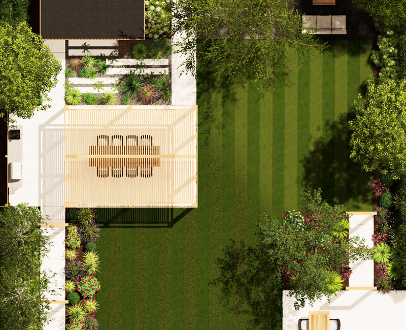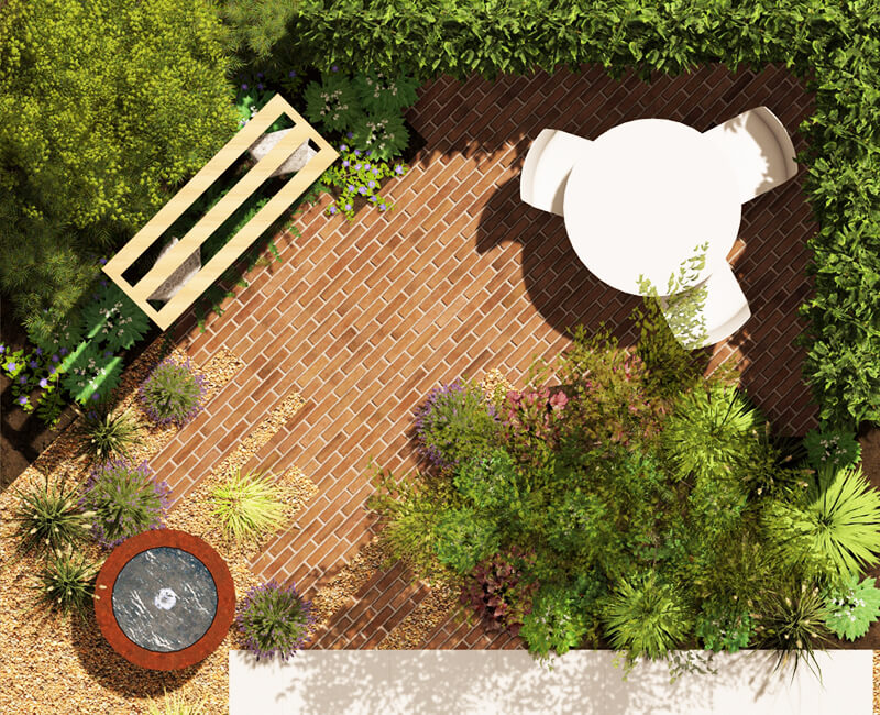 If your garden is more than double or more than half the size then you may need a more bespoke design which we can help with, just get in touch and we can start discussing this with you. If, however, the size difference isn’t that great we suggest that you use our plant border widths as a minimum measurement and push and pull the design around to suit your plot size. We do recommend that you maintain a minimum of 50% of the overall garden area as free draining and free from hard impermeable surfaces giving more plant and lawn area than paving. Your professional landscape contractor should be able to help with this.